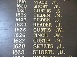 The Tilden families of America descend from John Tilden, a clothier of Benenden, born around 1400. His descendant, Nathaniel Tilden,[4] sailed with his family (his wife Lydia (nee Huckstep), seven children and seven servants) in March 1634 on the Hercules, from Sandwich, Kent to Massachusetts Bay Colony. Nathaniel Tilden, the first name on the passenger list of the Hercules, had been mayor of Tenterden in 1622 and his immediate family had held similarly official roles in Tenterden and the surrounding community. Nathaniel Tilden was chosen ruling elder of the first church of Scituate, Massachusetts within a year after his arrival. His name is recorded in the first conveyance of land recorded in Scituate in 1634: "of all that land which I have of Goodman Byrd lying within the fence at the north end of the third cliffe, unto the land of Nathaniel Tilden."