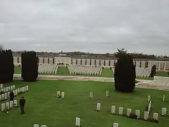 The Cross of Sacrifice that marks many CWGC cemeteries was built on top of a German pill box in the centre of the cemetery, purportedly at the suggestion of King George V, who visited the cemetery in 1922 as it neared completion.[1] The King's visit, described in the poem The King's Pilgrimage, included a speech in which he said: