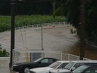 The last location Chataan affected was Japan. The typhoon forced the cancellation of 316 flights[22] and 150 train trips. The expressway between Shizuoka and Tokyo was closed.[23] At least 396 schools were closed in the country,[22] and a baseball game between the Yokohama DeNA BayStars and the Yakult Swallows was canceled due to the inclement weather.[24] Toyota temporarily closed most of its factories in the country.[25] Heavy rainfall, peaking at 509 mm (20.0 in) in Gifu Prefecture, fell across Japan. The rains flooded 10,270 houses in the country,[26] resulting in evacuation orders for about 145,000 people.[27] The floods damaged roads in 338 locations, and at least 10 bridges were destroyed.[28] About 15,000 evacuees were in Ogaki after a river exceeded its banks.[5] High rainfall caused hundreds of landslides,[15] two of which resulted in a death.[29] Floods killed at least three people.[15] Winds from the typhoon peaked at 97 km/h (60 mph) at Hachijō-jima.[26] High winds in Sakai, Osaka damaged 20 houses.[22] In Tokyo, the storm produced light winds and rains, despite passing within 102 km (63 mi).[5] Chataan destroyed 21 homes and damaged 239 others to some degree. During its passage, the typhoon destroyed 258.6 km2 (99.8 sq mi) of crops. The typhoon killed six people, left one person missing, and injured 30 others. Overall damage in Japan totaled about $500 million (¥59 billion 2002 JPY).[nb 4][26] During the storm, Yahoo! Japan received a record 359 million views, mostly due to people checking the website's weather section.[31]