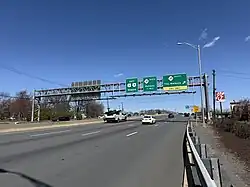 A short distance later, US 1/9 crosses into Rahway, Union County, where the road crosses the Rahway River before interchanging with Lawrence Street (CR 514) in the southbound direction.[1] The highway turns more northeast, becoming known as Edgar Road in Linden. In Linden, US 1/9 passes through a mix of industrial and business areas, crossing under Conrail Shared Assets Operations' Linden Industrial Track line before passing between Linden Airport and the former Linden Assembly plant used by General Motors to the west. Following the intersection with South Stiles Street (CR 615), the road enters more urbanized areas of homes and businesses. After passing near a couple of cemeteries, the highway runs to the west of Phillips 66's Bayway Refinery before passing under a Staten Island Railway freight line that is used by Conrail Shared Assets Operations.[1][9] After this bridge, US 1/9 meets the western terminus of I-278 at a partial interchange with a northbound exit and southbound entrance from US 1/9.[1] Past this interchange, US 1/9 continues into Elizabeth, where it intersects with South Elmora Avenue/Bayway (Route 439) at the Bayway Circle, which has been modified to allow US 1/9 to run straight through. At this point, US 1/9 splits from Edgar Road.[1][9] From the Bayway Circle, the road turns more to the east before making a sharp turn to the north-northeast and crossing the Elizabeth River on a skyway, which ends at the intersection with East Jersey Street. The road continues north through urban neighborhoods as Spring Street, passing under Conrail Shared Assets Operations' Elizabeth Industrial Track line. The highway reaches an intersection with North Avenue, at which point US 1/9 turns into a freeway with a local–express lane configuration, carrying two local lanes and two express lanes in each direction for a total of eight lanes.[1] The freeway comes to an interchange with the northern terminus of Route 81, and it continues around the west side of Newark Airport.[1][9]