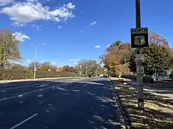 Past the I-476 interchange, US 1 continues east and heads into business areas, where the freeway ends and the route becomes four-lane divided South State Road, passing south of a shopping center. The route crosses into Springfield Township and reaches a diamond interchange with PA 320, with the southbound exit providing access to the shopping center. The road continues into residential areas and becomes North State Road upon crossing Springfield Road. US 1 curves northeast and crosses Darby Creek into Upper Darby Township, where it heads into business areas. State Road splits to the northeast and the route becomes Township Line Road, which heads north into Drexel Hill as a four-lane undivided road through residential neighborhoods. The road passes commercial development and curves to the northeast, forming the border between Haverford Township to the northwest and Upper Darby Township to the southeast. US 1 continues past homes as it heads through Drexel Hill, crossing Drexel Avenue and passing to the southeast of the Llanerch Country Club. The route heads into the community of Llanerch, where it gains a center left-turn lane and passes between a shopping center to the northwest and residences to the southeast. The road crosses Naylors Run and Darby Road/Lansdowne Avenue before it reaches an intersection with PA 3 a short distance later. From here, US 1 becomes a four-lane undivided road and continues northeast past residences and a few businesses before passing northwest of a golf course. The route passes over SEPTA's Norristown High Speed Line south of Township Line Road station before it comes to a bridge over Cobbs Creek.[2][4] Upon crossing Cobbs Creek, US 1 runs along the border between Haverford Township in Delaware County to the northwest and the city of Philadelphia in Philadelphia County to the southeast, passing between homes to the northwest and a golf course to the southeast.[2][4][5]