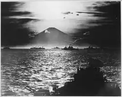By early February, Fifth Fleet had resumed control of the fast carrier task force and South Dakota was transferred to TG 58.3, along with New Jersey, the large cruiser Alaska, and several other warships. The fleet carriers conducted a series of air strikes on Japan, targeting the Tokyo area on 17 February, but bad weather made it difficult for the aircraft to operate. The ships of TG 58.3 were then sent to reinforce the invasion fleet during the Battle of Iwo Jima from 19 to 22 February. The carriers made repeated strikes as the marines went ashore on the first day of the landing. The ships of TF 58 were then recalled for another series of raids on Japan, targeting Tokyo on 25 February; planned attacks on Kobe and Nagoya were cancelled due to poor weather.[34]