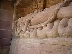 Udayagiri caves contain iconography of Hinduism and Jainism.[6][5] They are notable for the ancient monumental relief sculpture of Vishnu in his incarnation as the man-boar Varaha, rescuing the earth symbolically represented by Bhudevi clinging to the boar's tusk as described in Hindu mythology.[3] The site has important inscriptions of the Gupta dynasty belonging to the reigns of Chandragupta II (c. 375-415) and Kumaragupta I (c. 415-55).[7] In addition to these, Udayagiri has a series of rock-shelters and petroglyphs, ruined buildings, inscriptions, water systems, fortifications and habitation mounds, all of which remain a subject of continuing archaeological studies. The Udayagiri Caves complex consists of twenty caves, of which one is dedicated to Jainism and all others to Hinduism.[4] The Jain cave is notable for one of the oldest known Jaina inscriptions from 425 CE, while the Hindu caves feature inscriptions from 401 CE.[8]