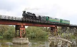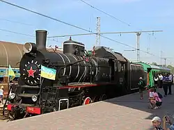Railways in Ukraine use various gauge types. The broad gauge (1,520 mm), a legacy of Imperial Russian and Soviet times, dominates the landscape, and narrow-gauge railways (750 mm) also exist, but plans are being made to construct, restore or switch to more standard-gauge railways (1,435 mm) for better train connections with the rest of Europe.[19] About half of railways in Ukraine are electrified (some of which have been damaged during the ongoing Russo-Ukrainian War and temporarily switched to diesel trains).[20]