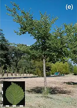 'Dehesa de Amaniel' grew at a comparatively fast rate of 90 cm per annum at the Puerta de Hierro nursery in Madrid. The spreading branches, which have corky tissue, form an irregular crown. The leaves, on 2.5 mm petioles, are round, typically acuminate at the apex, the average length and width 39 × 30 mm, the margins triple-serrate. The leaves are relatively sparsely distributed along the branchlets, and suffused dark-red on emergence, distinguishing them from the other selected Madrid clones. Foliar density relative to 'Sapporo Autumn Gold' is described as 'high'. However, in the Madrid study, the appearance of the tree was rated 3 / 5, the lowest score of all the trialled cultivars.[1] The tree is weak-wooded, and where planted in exposed locations has suffered extensive branch breakage.[2]