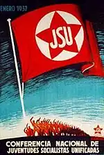The Unified Socialist Youth (Spanish: Juventudes Socialistas Unificadas; JSU) was a youth organization formed in the spring of 1936 in Spain through the amalgamation of the Spanish Socialist Workers' Party (PSOE) and Communist Party of Spain (PCE) youth groups. Its leader, Santiago Carrillo, came from the Socialist youth, but had secretly joined the Communist youth prior to the merger, and the group was soon dominated by the PCE.[1]