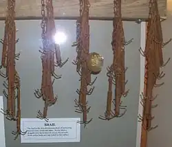 The need to "catch" freshwater mussels for the "pearl" button industry spurred the invention of tools to make the job easier than "pollywogging" with bare feet. In 1897 inventive mussel fishermen bent steel bars into wide open hooks which they called "brail hooks" or "crow foots" and used them to try to catch or trap the freshwater mussels. The process was simple: several of these "brail hooks" were attached to a long wooden bar with lengths of rope and the entire assembly was lowered into the river and dragged behind a boat along the river bottom. When the tips of these hooks came in contact with an "open" freshwater mussel, the mussel clamped its valves shut around the hooks and could be lifted from the bottom. Within a short period of time millions of freshwater mussels were collected in this manner.[14][15][16]