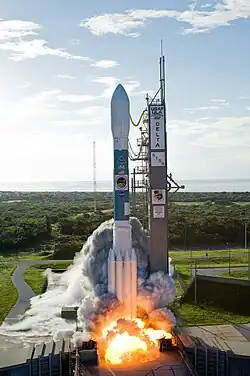 A Delta II rocket orbited a Soil Moisture Active Passive satellite in January 2015.[111] In March 2015, an Atlas V rocket carried NASA's Magnetospheric Multiscale Mission spacecraft,[112][113] and a Delta IV rocket orbited the GPS IIF-9 satellite on behalf of the U.S. Air Force.[114][115] The U.S. Air Force's X-37B spaceplane was carried by an Atlas V rocket in May 2015,[116] and a Delta IV orbited the WGS-7 satellite in July 2015.[117] The fourth MUOS satellite was orbited by an Atlas V in September 2015.[118][119] ULA's 100th consecutive successful liftoff was completed on 2 October 2015, when an Atlas V rocket orbited a Mexican Satellite System communications satellite on behalf of the Secretariat of Communications and Transportation.[110] The classified NROL-55 satellite was launched by an Atlas V rocket several days later.[120] Atlas V rockets launched GPS Block IIF satellites and the Cygnus cargo spacecraft in November 2015 and December 2015, respectively.[121][122][123]