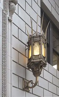 At the building's west end, constructed eight years later and facing Broadway, the façade is similar to the eastern one, but the main body of the building extends to the corners of the lot, and instead of a full-width portico there is a recessed portico with only two columns in the center. Six pilasters line the eastern façade, three to each side of the columns, all topped by Corinthian capitals, the same as on the building's other two exposed sides. Another difference from the eastern façade is that, on the western façade, "United States National Bank" is inscribed in the central section of the frieze, in place of the rinceau decoration there at the building's opposite end.[19] Ornamental bronze lanterns flank the central entrance, which features bas relief panels cast in bronze in 1926–27 and designed by Avard Fairbanks. The panels at the western entrance "depict pivotal events in the historical development of the Columbia Basin".[19]
