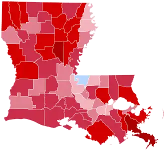 Nixon carried Louisiana with 65.32% of the vote to McGovern's 28.35%, a victory margin of 36.97%, making Louisiana 13.8% more Republican than the nation-at-large, and marking the strongest Republican presidential performance in Louisiana history. In a result that would reflect McGovern's national performance, the Democratic candidate only won one parish (West Feliciana) in Louisiana. As of the 2024 presidential election, this is the last election when Madison Parish, St. Helena Parish, East Carroll Parish, and the city of New Orleans (coterminous with Orleans Parish) have voted for a Republican presidential candidate.[1]
