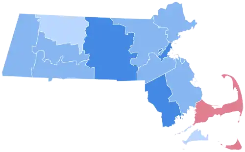 | Nantucket | 1,115 | 42.46% | 1,399 | 53.27% | 112 | 4.27% | -284 | -10.81% | 2,626 |