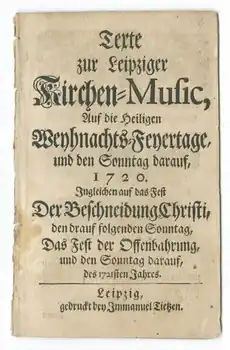 - ^ Glöckner 2000, p. 118 The title page reads: Texte | zur Leipziger | Kirchen Music, | auf die Heiligen | Weynachts-Feyertage, | und den Sonntag darauf, | 1720. | Ingleichen auf das Fest | Der Beschneidung Christi, | den darauf folgenden Sonntag, | Das Fest der Offenbahrung, | und den Sonntag darauf, | des 1721sten Jahres. | Leipzig, | gedruckt bey Immanuel Tietzen.