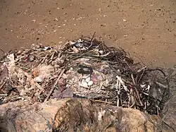 The upland buzzard breeds between April and August, with egg laying tending to occur in May.[9][10][39] Nests tend to be located on outcrops, crags and ledges of cliffs, usually in locations blocked from the elements by rocks or vegetation. Some nests additionally are placed on steep rocky slopes.[2][4] The nest is constructed with sticks and well lined, often with wool, grass, dry dung and, perhaps detrimentally, human garbage.[2][40] This species normally lays a clutch of 2 to 4 eggs and, if an entire clutch is lost, they are capable of laying a replacement clutch.[2] In Mongolia, clutch sizes have been recorded exceptionally varying up to 8, with an average clutch size reported as 3.49.[29] Incubation lasts 36 to 38 days, although previously reported at only about 30 days.[17][39] The chicks bear greyish-brown down and develop fairly slowly, fledgling at around 45 days.[39] In western and central Mongolia, brood size averaged 1.95.[29] Commonly, two young often fledge from upland buzzard, though up to four fledglings have been recorded.[4] Breeding success is known to be food based and higher sibling competition and perhaps siblicide have been reported in instances where stable prey such as voles decline in population.[28][41]