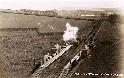 Upwey Wishing Well Halt was a railway station at Bincombe in the county of Dorset in England. It served the northern part of the village of Upwey, now a suburb of Weymouth, on what is now known as the Heart of Wessex Line and the South West Main Line.