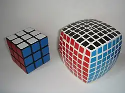 The V-Cube 7 is a combination puzzle in the form of a 7×7×7 cube. The first mass-produced 7×7×7 was invented by Panagiotis Verdes and is produced by the Greek company Verdes Innovations SA. Other such puzzles have since been introduced by a number of Chinese companies,[1] some of which have mechanisms which improve on the original. Like the 5×5×5, the V-Cube 7 has both fixed and movable center facets.