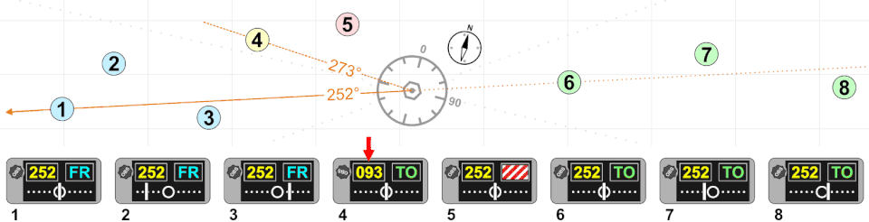 In the illustration on the right, notice that the heading ring is set with 360° (north) at the primary index, the needle is centred and the To/From indicator is showing "TO". The VOR is indicating that the aircraft is on the 360° course (north) to the VOR station (i.e. the aircraft is south of the VOR station). If the To/From indicator were showing "From" it would mean the aircraft was on the 360° radial from the VOR station (i.e. the aircraft is north of the VOR). Note that there is absolutely no indication of what direction the aircraft is flying. The aircraft could be flying due West and this snapshot of the VOR could be the moment when it crossed the 360° radial.
