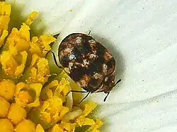 The varied carpet beetle (Anthrenus verbasci) is a 3 mm-long beetle belonging to the family Dermestidae, positioned in subgenus Nathrenus. They are a common species, often considered a pest of domestic houses and, particularly, natural history museums, where the larvae may damage natural fibers and can damage carpets, furniture, clothing, and insect collections. A. verbasci was also the first insect to be shown to have an annual behavioral rhythm[1] and remains a classic example of circannual cycles in animals.