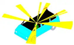 Rearward invisibility is an entirely different matter. The area directly behind vehicles is the source of backup collisions, particularly involving pedestrians, children, and objects directly aft of a vehicle. That area has been called a "killing zone".[12][13] These problems are the object of several technological solutions, including (in rough order of technological complexity, simplest first): rear-view mirror, side-view mirror, Fresnel lens, sonar, parking sensors, and backup camera. A similar problem attaches to positions left and right of a vehicle's rear bumper as the driver attempts to back out of a parking space. Specially designed cross-traffic alert warning systems have been developed to address these.[6][14][15]