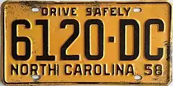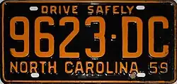 1953 | Embossed golden yellow serial on black plate; "NORTH CAROLINA 53" or "N.C.", slogan and "53" at bottom (see right) | none, or "DRIVE SAFELY" between state abbreviation and year | 123-456 | 100-001 to 760-000 |