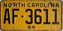 | 1964 | Embossed black serial on golden yellow plate; "NORTH CAROLINA" at top; "64" centered at bottom | none | A-1234 AB-1234 |