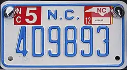 Motorcycle | 1999–present | Embossed blue on white with border line; "N.C." at top | 1A2345 | 1A0001 to present | Letter advances before leftmost number (1A-1Z, 2A-2Z, etc.). G, I, O, Q and U not used. Issuing 9C series as of May 5, 2024. |