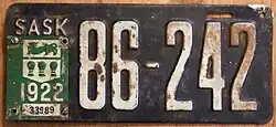 1918 | White on green flat metal; vertical "SASK" and "1918" at left and right respectively | none | 12345 | 1 to approximately 54000 | Some later plates embossed. |