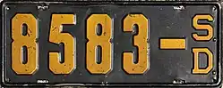 1932 | Embossed yellow on black with border line; vertical "SD" and "32" at left and right respectively | none | 1-1234 10-1234 |