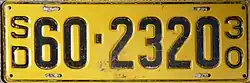 1930 | Embossed black on yellow with border line; vertical "SD" and "30" at left and right respectively | none | 1-1234 10-1234 |