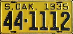 1935 | Embossed black on yellow with border line; "S. DAK. 1935" at top | none | 1-1234 10-1234 |