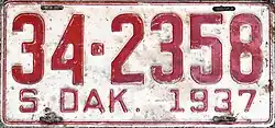 1937 | Embossed red on white with border line; "S. DAK. 1937" at bottom | none | 1-1234 10-1234 |