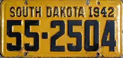 1940 | Embossed black on golden yellow; "SOUTH DAKOTA 1940" at top | none | 1-1234 10-1234 |