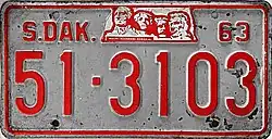 1963 | Embossed red on reflective white with border line; "S.DAK.", stamped Mount Rushmore graphic and "63" at top | none | 1-12345 10-1234 |
