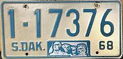 1968 | Embossed light blue on reflective white with border line; "S.DAK.", stamped Mount Rushmore graphic and "68" at bottom | none | 1-12345 10-1234 |