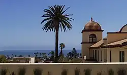 In 1769, the Spanish Portolà expedition, first recorded European visitors to inland areas of California, came down the Santa Clara River Valley from the previous night's encampment near today's Saticoy and camped near the outlet of the Ventura River on August 14. Fray Juan Crespi, a Franciscan missionary traveling with the expedition, noted that "we saw a regular town, the most populous and best laid-out of all that we had seen on the journey up to the present time."[20] Archaeological records found that the Chumash village they encountered was settled sometime around AD 1000. Junípero Serra, first leader of the Franciscans in California, founded Mission San Buenaventura in 1782 as his ninth and last mission established near the Chumash village as part of Spain's colonization of Alta California.[21] The mission was named for St. Bonaventure, a 13th-century Franciscan saint and a Doctor of the Church. San Miguel Chapel was the first outpost and center of operations while the first Mission San Buenaventura was being constructed. The first mission burned in 1801 and a replacement building of brick and stone was completed in 1809. The bell tower and facade of the new mission was destroyed by an 1812 earthquake.[22][23] The Mission was rebuilt and functions as a parish church.