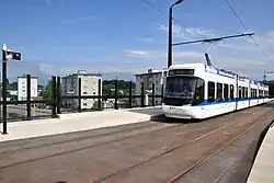 The joint tram network of the VBZ and VBG comprises 15 separate lines: 2, 3, 4, 5, 6, 7, 8, 9, 10, 11, 12, 13, 14, 15 and 17 (lines 10 and 12 are jointly operated with VBG, and line 20 is operated by AVA). The former tram line 1 was later converted into trolleybus line 31.[8] The network operates on meter gauge track, electrified using overhead line at 600 V DC. The VBZ infrastructure is largely street based, with varying degrees of segregation from other street traffic but little use of dedicated rights of way for the trams with the notable exception of a tram tunnel in north-east Zurich that was originally built for an abortive metro system, and modified for tram usage. By contrast, on VBG infrastructure, VBZ trams operate on long stretches of dedicated track.[6][9]