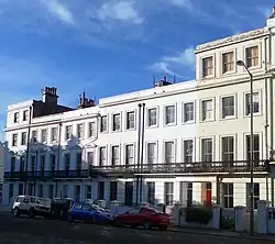 Vernon Terrace is a mid 19th-century residential development in the Montpelier suburb of Brighton, part of the English coastal city of Brighton and Hove. Construction of the first section started in 1856, and the 37-house terrace was complete in the early 1860s. Architecturally, the houses divide into five separate compositions,[1] although all are in a similar late Regency/Italianate style. This was characteristic of houses of that era in Brighton, and especially in the Montpelier area—where the Regency style persisted much later than elsewhere. Standing opposite is the landmark Montpelier Crescent, which had a view of the South Downs until Vernon Terrace blocked it. Three groups of houses in the terrace have been listed at Grade II by English Heritage for their architectural and historical importance.