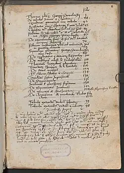 Vienna ÖNB 5203[1] is a fifteenth-century astronomical multiple-text (and multi-graphical), miscellany manuscript conserved at the Austrian National Library (Österreichischen Nationalbibliothek).[2] One of the main features of this codex is that it has been largely copied by the hand of Regiomontanus,[3] a famous German mathematician, astrologer and astronomer of the fifteenth century. Apart from Regiomontanus’ autograph, Vienna ÖNB 5203 contains examples of two other scribal hands, one of which belongs to Georg von Peurbach, who was as well an astronomer, mathematician and instrument maker of Austrian origin. The manuscript also contains a number of Peurbach's works, including his most famous one – Theoricae Novae Planetarum, a re-elaboration of Ptolemaic astronomy theories in a more comprehensive way. Other treatises in Vienna ÖNB 5203 touch upon a great variety of subjects, including astronomy, astrology, music, mathematics and physics.[4]