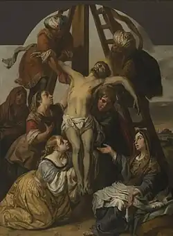 Boucquet painted biblical and historical subjects as well as portraits. Boucquet's works are found in various churches of the towns near Veurne, including in Nieuwpoort, Alveringem, Lo-Reninge, Ypres and Ostend. Many of his religious paintings and portraits that were kept in public buildings were destroyed during the heavy battles waged in this part of Flanders during World War I.[1] As a painter Boucquet had recognized but limited talents. He is appreciated for his palette and his skill in realistically depicting clothing and fabrics.[5] His anatomical depiction of the human body is sometimes inaccurate and the faces of his figures often look similar.[4]