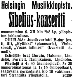 The Violin Sonatina received its premiere in Helsinki, Finland, on 6 December 1915, on the occasion of the semi-centennial of Sibelius's birth (during which there were many concerts celebrating the composer); the soloists were the Polish-American violinist Richard Burgin and the Finnish pianist Eino Lindholm. Also on the program was the String Quartet in B-flat major (Op. 4, 1890), the suite for solo piano Kyllikki (Op. 41, 1904), and the String Quartet in D minor, Voces intimae (Op. 56, 1909).[1]