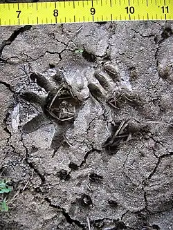 Virginia opossum tracks generally show five finger-like toes in both the fore and hind prints.[22] The hind tracks are unusual and distinctive due to the opossum's opposable thumb, which generally prints at an angle of 90° or greater to the other fingers (sometimes near 180°). Individual adult tracks generally measure 1.9 in long by 2.0 in wide (4.8 × 5.1 cm) for the fore prints and 2.5 in long by 2.3 in wide (6.4 × 5.7 cm) for the hind prints. Opossums have claws on all fingers fore and hind except on the two thumbs (in the photograph, claw marks show as small holes just beyond the tip of each finger); these generally show in the tracks. In a soft medium, such as the mud in this photograph, the foot pads clearly show (these are the deep, darker areas where the fingers and toes meet the rest of the hand or foot, which have been filled with plant debris by wind due to the advanced age of the tracks).