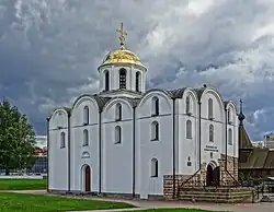2. ^ The Annunciation Church is a six-pillared building with one apse. It is built of hewn limestone quadras, each row being separated by two rows of brick, covered with a thin layer of stucco so as to emulate large blocks of stone. This technique was widespread in Byzantium; but there are only two examples north of Crimea — one in Vitebsk and another, unfinished and long ruined church in Navahrudak, probably by the same team of Byzantine builders. Another extraordinary feature of the church is that its bays are equal and the central nave is square in plan. The choir gallery occupies the western bay; it adjoins two secluded chapels over the lateral aisles. Stairs leading to the gallery are built into the western wall. [13]