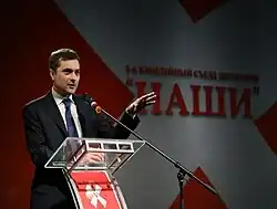During this time, Surkov helped create some pro-government youth movements, including Nashi. He met with their leaders and participants several times and gave them lectures on the political situation.[54][55] Nashi has been compared by Edward Lucas as the Putin government's version of the Soviet-era Komsomol.[56]
