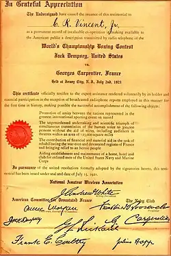 Meanwhile, fight promoters were looking for ways to improve the image of their sport and increase its popularity. In January 1921, a bout between Benny Leonard and Richie Mitchell at the Madison Square Garden arena in New York City was conducted as a benefit for the American Committee for Devastated France, working with philanthropist Anne Morgan, who was chair of that charity's executive committee.[5] Julius Hopp, manager of Madison Square Garden concerts, who helped coordinate the charity match, was on the lookout for additional opportunities. In March 1921 he was reportedly introduced to radio broadcasting, after being "impressed with the skill of New York amateur radio men as disclosed at the Second District Convention",[6] which was held at the Hotel Pennsylvania in New York City. One feature of this convention was that "music sent from the Bedloe Island Signal Corps Station [WVP][7] via radiofone was heard almost continuously".[8]