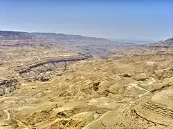 The Mujib Reserve of Wadi Mujib is located in the mountainous landscape to the east of the Dead Sea, in the southern part of Jordan valley, approximately 90 kilometres (56 mi) south of Amman. A 212 km2 (82 sq mi) reserve was created in 1987 by the Royal Society for the Conservation of Nature and is regionally and internationally important, particularly for the bird life that the reserve supports.[3] In 2011, UNESCO declared Mujib biosphere reserve.[1] It extends to the Kerak and Madaba mountains to the north and south, reaching 1,277 metres (4,190 ft) above sea level in some places. This 1,708-metre (5,604 ft) variation in elevation of its drainage basin, combined with the valley's year round water flow from seven tributaries, means that Wadi Mujib enjoys magnificent biodiversity that is still being explored and documented.[4] The reserve consists of mountainous, rocky, and sparsely vegetated desert (up to 800 metres (2,600 ft)), with cliffs and gorges cutting through plateaus. Perennial, spring-fed streams flow to the shores of the Dead Sea.