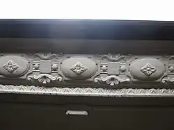 A faience mosaic on the wall that depicts a New Amsterdam step-gabled house with the palisade wall in front of it. The mosaic is topped by blue faience swags. There is a faience cornice with scrolled and foliate detail.