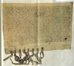 Under the new abbot, Abbot John, the abbey sought the return of those lands. The case appears to have gone to Bishop Walter's consistorial court, which he held at the chapel of Innerpeffry. Here Naomhán and Mairead agreed to accept a payment of 40 marks in exchange for returning the documents of ownership given to them by the abbot and for acknowledging the abbey's ownership. The couple pledged to honour the agreement by swearing an oath on the chapel's Gospels.[38] The case then proceeded to a hearing held under Robert Stewart, Earl of Strathearn and High Steward of Scotland (later King Robert II), at Perth, where the couple were forced under the threat of severe penalties to swear again never to renew their claim.[39] The decision was sealed by the witnesses, including Bishop Walter, at a Perth church on 30 November 1365.[40]