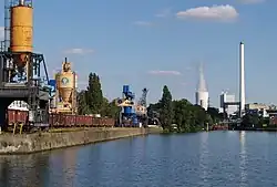 - Westhafen Wanne (literal: "Wanner west port"[5]): This area is now home to a logistics centre constructed in the 1990s known as the Güterverkehrszentrum Emscher[6] (or GVZ Emscher) with rail and road links as well as canal access, the WHE operates the rail links.[7] This port handles coal, and intermodal traffic.