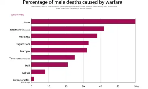 Estimates for total deaths due to war vary widely. In one estimate, primitive warfare from 50,000 to 3000 BCE has been thought to have claimed 400 million±133,000 victims based on the assumption that it accounted for the 15.1% of all deaths.[57] Ian Morris estimated that the rate could be as high as 20%.[58] Other scholars find the prehistoric percentage much lower, around 2%, similar to the Neanderthals and ancestors of apes and primates.[59]
