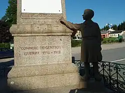 After World War I, some towns in France set up pacifist war memorials. Instead of commemorating the glorious dead, these memorials denounce war with figures of grieving widows and children rather than soldiers. Such memorials provoked anger among veterans and the military in general. The most famous is at Gentioux-Pigerolles in the department of Creuse. Below the column which lists the name of the fallen stands an orphan in bronze pointing to an inscription 'Maudite soit la guerre' (Cursed be war). Feelings ran so high that the memorial was not officially inaugurated until 1990 and soldiers at the nearby army camp were under orders to turn their heads when they walked past. Another such memorial is in the small town of Équeurdreville-Hainneville (formerly Équeurdreville) in the department of Manche. Here the statue is of a grieving widow with two small children.[5][6]