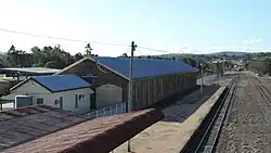 Warwick railway station is an amalgam of buildings dating from the mid-1880s, when this site became the principal railway station in Warwick. The buildings include a sandstone goods shed and passenger station, a turntable, various staff dwelling and recreational buildings, warehouses and a goods sale yard complex.[1]